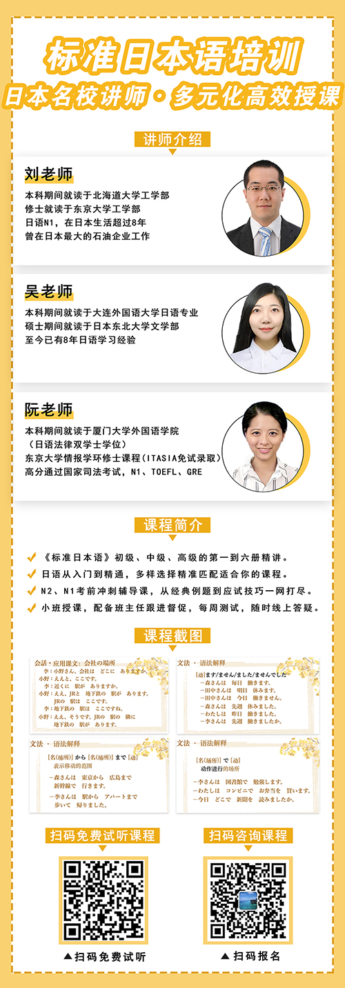 課程講師均畢業(yè)于日本國(guó)立名校,有豐富的留日經(jīng)驗(yàn)和日語(yǔ)授課經(jīng)驗(yàn),教你地道的日語(yǔ)和應(yīng)試備考技巧。